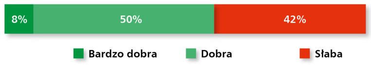 Przeprowadzone badanie wskazuje na zróżnicowany rozkład ocen dotyczących bieżącej sytuacji w branży obudów i szaf przemysłowych. Zaledwie 8% ankietowanych uznało sytuację za „bardzo dobrą”. Połowa (50%) oceniła ją jako „dobrą”, podczas gdy aż 42% respondentów wskazało na „słabą” kondycję sektora (rys. 1). Wyniki te, mniej korzystne niż w badaniach z poprzednich lat, odzwierciedlają wyzwania związane z rosnącymi kosztami działalności i presją inwestycyjną po stronie klientów.