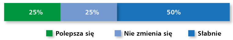 Jeszcze wyraźniej ostrożne nastroje widać w odpowiedziach dotyczących koniunktury. Połowa ankietowanych (50%) uznała, że sytuacja rynkowa słabnie, podczas gdy po 25% badanych wskazało na brak zmian lub poprawę (rys. 2). Rozkład ten sugeruje, że branża znajduje się obecnie w fazie spowolnienia, przy czym część dostawców sygnalizuje utrzymanie stabilnej pozycji, a tylko mniejszość dostrzega oznaki ożywienia.