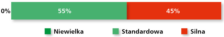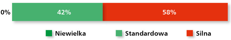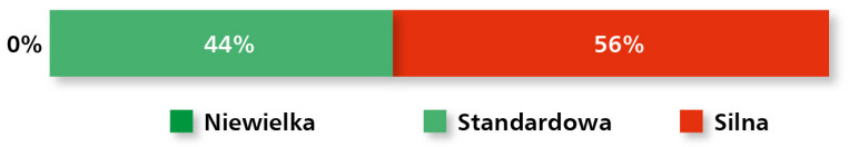 Jeśli chodzi o charakter konkurencji, dominuje postrzeganie jej jako „silnej” (56%) lub „standardowej” (44%), przy całkowitym braku wskazań na konkurencję niewielką (rys. 21). Branża pozostaje więc mocno nasycona, a dostawcy muszą rywalizować nie tylko ceną, lecz także zakresem oferty i innowacyjnością produktów.