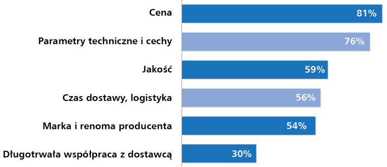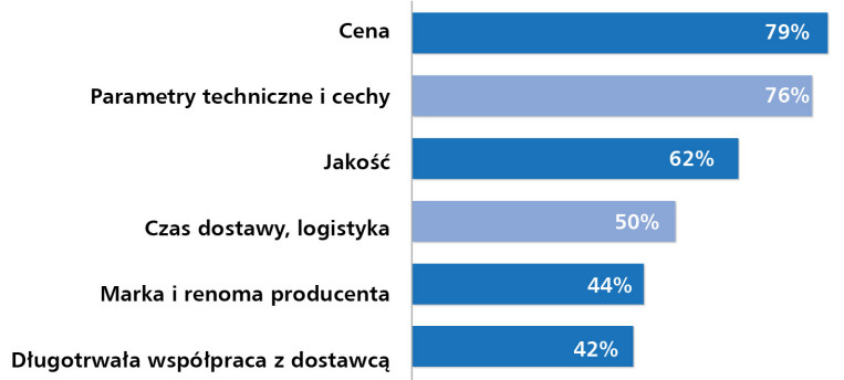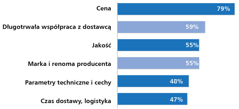 Analiza wyników pokazuje wyraźne przesunięcie akcentów. O ile cena zawsze była kryterium istotnym, o tyle dziś jej dominacja jest jeszcze bardziej widoczna. Z kolei jakość i parametry techniczne, które wcześniej znajdowały się wyżej w zestawieniu, obecnie ustępują miejsca relacjom handlowym oraz marce producenta. To potwierdza, że rynek funkcjonuje dziś w realiach silnej presji kosztowej, a decyzje zakupowe częściej niż kiedyś podporządkowane są ekonomii i przewidywalności współpracy.