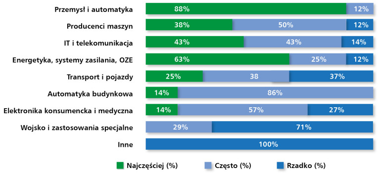 Branże takie, jak IT i telekomunikacja oraz energetyka i OZE znalazły się raczej w kategorii zastosowań okazjonalnych – w obu przypadkach ponad połowa respondentów uznała wykorzystanie komponentów w tych obszarach za „rzadkie”. Podobnie stało się w przypadku elektroniki konsumenckiej i medycznej, jednoznacznie ocenionej jako obszar marginalny (100% wskazań „rzadko”).