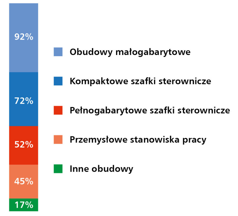 Na drugim miejscu znalazły się kompaktowe szafki sterownicze (72%), które pozostają podstawowym elementem infrastruktury w zakładach wytwórczych i u producentów OEM. Ich wysoka pozycja potwierdza, że rynek potrzebuje rozwiązań średniej wielkości, łączących funkcjonalność i możliwość indywidualizacji z atrakcyjnym poziomem kosztów.