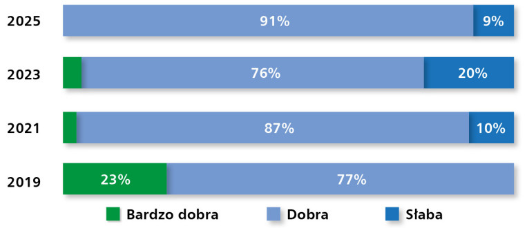 Wyniki badania przeprowadzonego przez redakcję pokazują, że oceny dostawców dotyczące sytuacji w branży komponentów sterowniczo-sygnalizacyjnych są zróżnicowane – od umiarkowanego optymizmu po wskazania świadczące o ostrożności inwestycyjnej. Ponad połowa respondentów (56%) uznała sytuację na rynku za „dobrą”, jednak aż 44% oceniło ją jako „słabą”, a nikt nie wskazał na stan „bardzo dobry” (rys. 19). Wyniki te pokazują, że choć sektor utrzymuje stabilny poziom sprzedaży, widoczne są wyraźne napięcia kosztowe i ograniczenia inwestycyjne po stronie odbiorców.