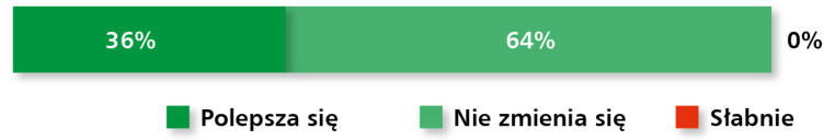 Oceny dotyczące koniunktury potwierdzają stabilizację – ponad połowa badanych (64%) uznała, że sytuacja nie ulega większym zmianom, a 36% zauważyło oznaki poprawy. Brak wskazań na pogorszenie (rys. 11) wskazuje, że rynek wchodzi w fazę równowagi, po wcześniejszych wahaniach związanych z koniunkturą przemysłową.