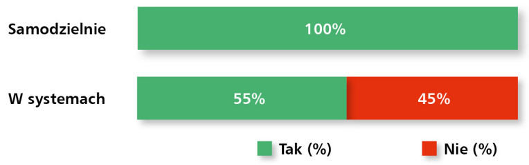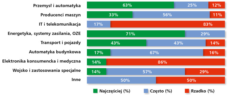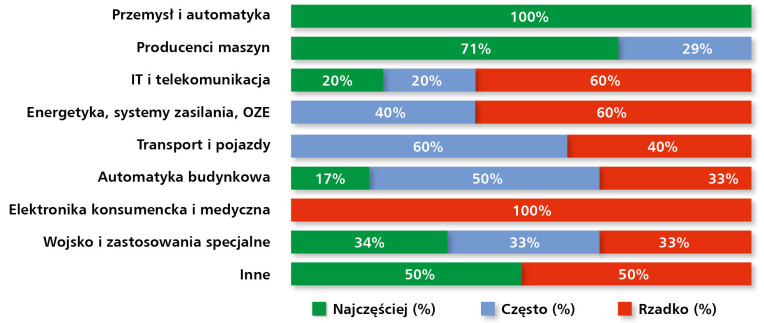 Mniej jednoznaczne są wyniki dotyczące innych sektorów. W przypadku transportu i pojazdów dominowały wskazania „często” (60%), co odzwierciedla rosnące znaczenie systemów sygnalizacji i sterowania w nowoczesnych środkach transportu. Automatyka budynkowa uzyskała natomiast mieszane wyniki – 17% wskazało ją jako obszar „najczęstszego” wykorzystania, 50% odpowiedzi dotyczyło zaś użycia „częstego”, a 33% „rzadkiego”. Wskazuje to na zróżnicowaną dynamikę tego rynku, uzależnioną od specyfiki projektów inwestycyjnych.