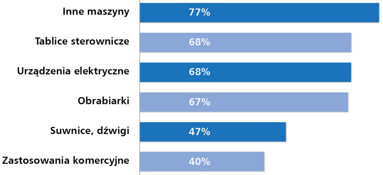Wyniki wskazują na utrzymującą się przewagę przemysłu, automatyki i energetyki jako kluczowych obszarów zastosowań. W poprzedniej edycji badania wyraźniej akcentowano także budownictwo i automatykę budynkową, które dziś plasują się niżej, co może wynikać z osłabienia tempa inwestycji w tym segmencie. Jednocześnie większą rolę niż wcześniej zaczynają odgrywać transport oraz aplikacje w branży IT i telekomunikacji, co świadczy o stopniowym rozszerzaniu obszarów zastosowań i rosnącym znaczeniu cyfryzacji oraz nowych technologii w gospodarce.