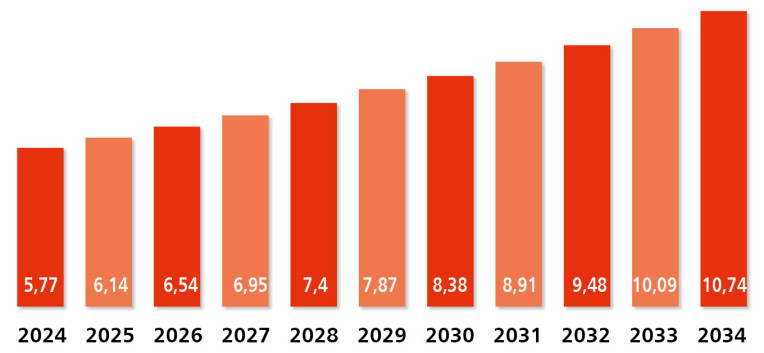 Wypadkową tych czynników będzie wzrost wartości światowego rynku systemów bezpieczeństwa maszyn średnio o blisko 6% rocznie – z niecałych 6 mld dol. w 2024 r. do prawie 11 mld dol. w 2034 r., według Precedence Research (rys. 1). Dotychczas największy udział miały w nim czujniki, ale w okresie objętym prognozą najszybciej będzie się rozwijać segment wyłączników. Do tej pory największą popularnością cieszyły się wbudowane funkcje bezpieczeństwa. W przyszłości jednak najszybciej będzie się upowszechniać podejście, w którym komponenty bezpieczeństwa dodaje się do maszyn jako oddzielne jednostki.