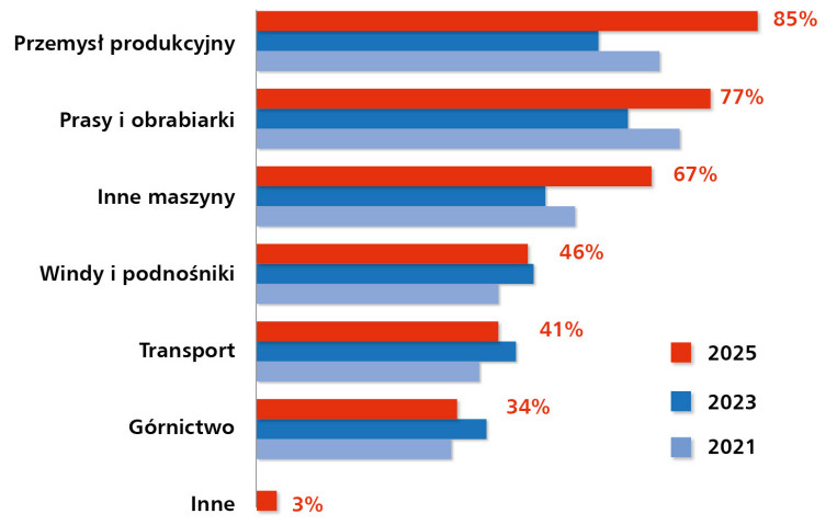 Wyniki badania ankietowego przeprowadzonego przez redakcję w marcu tego roku wśród polskich dostawców komponentów i usług związanych z bezpieczeństwem maszyn jasno pokazują, że świadomość techniczna w tym obszarze jest dziś wyższa niż kiedykolwiek wcześniej. Spośród wszystkich obszarów zastosowań systemów zabezpieczających, najwyższy odsetek wskazań (85%) dotyczy przemysłu produkcyjnego jako całości (rys. 3). To właśnie tam – w środowiskach charakteryzujących się dużym zagęszczeniem maszyn, wysoką wydajnością cyklów produkcyjnych i obecnością operatorów – ryzyko wystąpienia incydentów jest największe, a jednocześnie możliwość ich ograniczenia dzięki nowoczesnym środkom ochronnym – najpełniej wykorzystywana.
