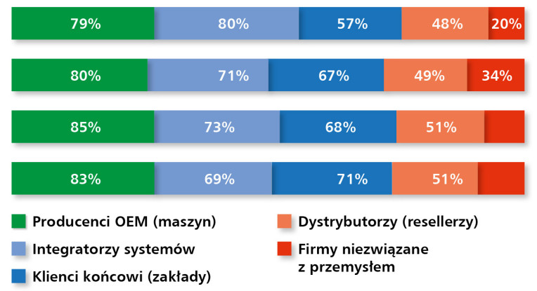 Z danych pozyskanych w przeprowadzonym badaniu wynika, że za najbardziej perspektywiczną grupę odbiorców systemów bezpieczeństwa uznaje się obecnie producentów maszyn (rys. 12). To segment o wyjątkowej dynamice – obejmujący zarówno producentów OEM, jak i wykonawców jednostkowych konstrukcji dostosowanych do konkretnych procesów technologicznych. Ich znaczenie rośnie m.in. z uwagi na wzrost udziału projektów tworzonych pod kątem zgodności z Dyrektywą Maszynową, coraz częściej również w środowiskach opartych na założeniach Przemysłu 4.0.