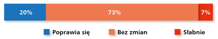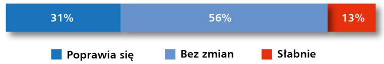 Warto jednak podkreślić, że koniunktura postrzegana jest raczej stabilnie: 56% uczestników badania uznało, że nie zaszły większe zmiany, a 31% zauważyło poprawę (rys. 21). Spadek aktywności lub trudniejsze warunki rynkowe wskazało tylko 13% respondentów, co może świadczyć o względnej odporności rynku ATEX na szoki zewnętrzne, a także o wysokim poziomie specjalizacji i niszowym charakterze sektora.