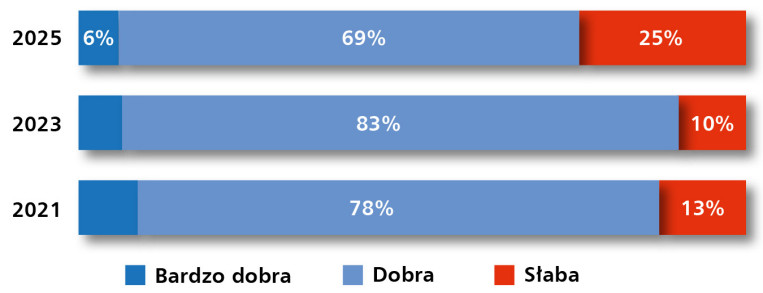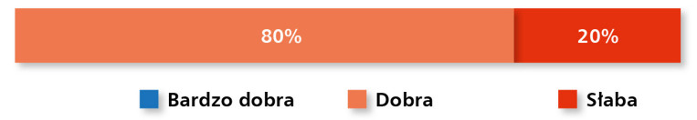 Ocena bieżącej sytuacji na rynku ATEX w Polsce pozostaje generalnie pozytywna, choć niejednoznaczna. 69% określiło ją jako „dobrą”, natomiast 6% uznało, że sytuacja jest „bardzo dobra” (rys. 20). Jednocześnie aż 25% ankietowanych oceniło ją jako „słabą”, co wskazuje na pewne zróżnicowanie doświadczeń rynkowych – prawdopodobnie wynikające z różnic branżowych, typów oferowanych produktów lub skali działalności dostawców.