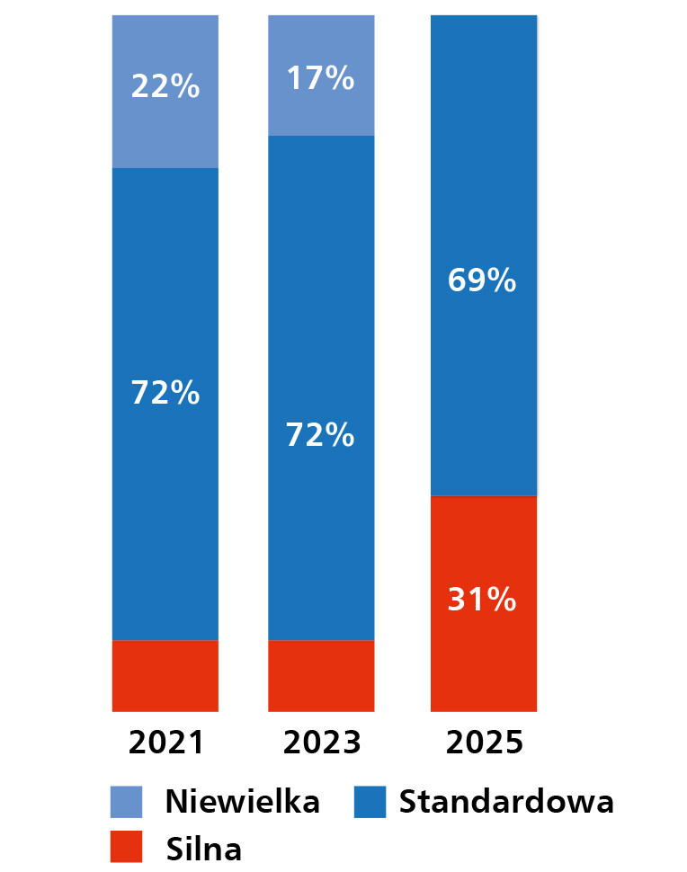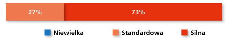 Jednym z istotnych wyznaczników kondycji sektora jest poziom konkurencji. Według danych z przeprowadzonego badania, 73% ankietowanych ocenia, że rywalizacja na rynku jest silna (rys. 7). To wyraźny wzrost w porównaniu z wcześniejszymi latami, kiedy w badaniach dominowały odpowiedzi wskazujące na „standardowy” poziom konkurencji. Dziś tylko 27% respondentów tak postrzega rynek. Nie odnotowano żadnych opinii o „niewielkiej” konkurencji, co świadczy o nasyceniu branży oraz rosnącym znaczeniu specjalizacji i przewagi technologicznej.