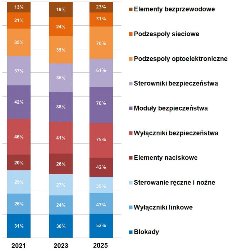 Na końcu zestawienia znalazły się podzespoły sieciowe (31%) oraz elementy bezprzewodowe (23%), których zastosowanie rośnie, choć wciąż jest ograniczone przez kwestie związane z niezawodnością transmisji i akceptacją w aplikacjach krytycznych. Niemniej, popularyzacja przemysłowych sieci Ethernet, w tym rozwiązań takich jak Safety over EtherCAT, Profinet Failsafe czy EtherNet/IP CIP Safety, wskazuje kierunek, w jakim zmierza technologia integracji systemów bezpieczeństwa z układami sterowania.