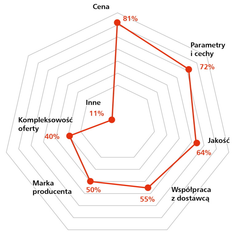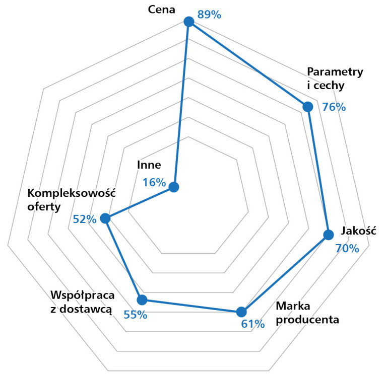Na kolejnych miejscach znalazły się parametry techniczne i funkcjonalne – wskazane przez 72% respondentów, oraz jakość wykonania (64%). To pokazuje, że oczekiwany przez odbiorców kompromis opiera się na równowadze między kosztami a realną wartością użytkową produktu. W porównaniu z innymi kategoriami produktowymi nieco niższe znaczenie przypisywane jest współpracy z dostawcą (55%), a także marce producenta (50%). Kompleksowość oferty, jako czynnik sam w sobie, uzyskała 40%, co sugeruje, że klienci częściej wybierają produkty dostosowane do konkretnych potrzeb niż gotowe, szeroko zakrojone katalogi.