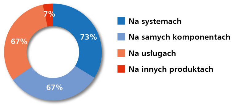 Tak zdefiniowane oczekiwania klientów przekładają się wprost na strukturę przychodów w branży. Coraz większą rolę odgrywa sprzedaż kompletnych systemów bezpieczeństwa – rozwiązań składających się z wielu wzajemnie powiązanych komponentów, często dostosowanych do specyfiki danego procesu. Aż 73% respondentów wskazało właśnie systemy jako najważniejsze źródło przychodu (rys. 11), co potwierdza rosnącą wagę integracji i projektowania rozwiązań szytych na miarę.