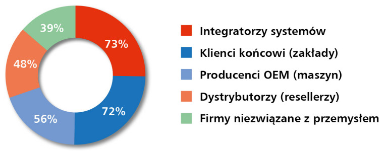 Trzecie miejsce zajmują końcowi użytkownicy – zakłady przemysłowe – z 57% wskazań. To oni odpowiadają za ostateczne wdrożenie i przestrzeganie zasad bezpieczeństwa na poziomie operacyjnym. W ich przypadku wdrożenie często dotyczy modernizacji istniejących maszyn, ich doposażenia lub rekonfiguracji, w odpowiedzi na zmieniające się przepisy lub warunki eksploatacji.