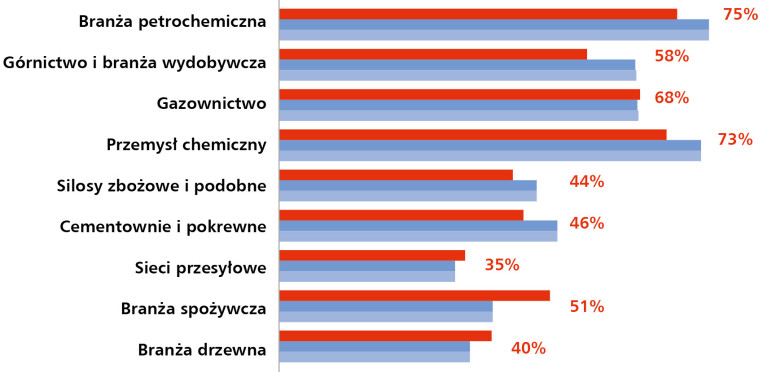 Wysokie miejsce zajmuje również branża spożywcza (51%), co jest wynikiem obecności pyłów organicznych i fermentujących gazów w procesach technologicznych. Na liście znalazły się też cementownie (46%), silosy zbożowe (44%), branża drzewna (40%) oraz sieci przesyłowe (35%), co dowodzi, że ryzyko atmosfery wybuchowej nie ogranicza się do klasycznie kojarzonych aplikacji gazowych czy górniczych. Świadomość konieczności stosowania certyfikowanych urządzeń w tych środowiskach jest dziś znacznie wyższa, co przekłada się na szerokie spektrum branż objętych wymaganiami ATEX.