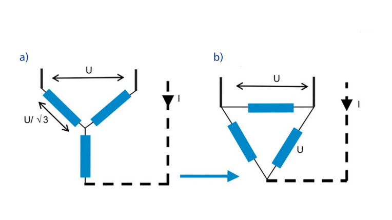 pierwszym układzie wszystkie trzy uzwojenia stojana jednym końcem są złączone we wspólnym punkcie. Drugi koniec każdego z nich podłącza się natomiast do kolejnych faz sieci zasilającej. W rezultacie tworzą obwód w kształcie gwiazdy (rys. 2a). W takiej konfiguracji każde z uzwojeń jest zasilane napięciem fazowym, mniejszym o √3 od napięcia międzyfazowego. Ponieważ moment pozostaje proporcjonalny do kwadratu napięcia, jest on 3-krotnie mniejszy niż w drugim układzie. Prąd rozruchowy pobierany z sieci zasilającej jest o 1/3 mniejszy w porównaniu z tym, jaki silnik pobiera, jeżeli jego uzwojenia zostaną połączone w trójkąt. W takim przypadku koniec jednego uzwojenia zostaje połączony z początkiem następnego. Te punkty wspólne są natomiast łączone z poszczególnymi fazami sieci zasilającej (rys. 2b). W efekcie każde uzwojenie silnika jest zasilane napięciem międzyfazowym.