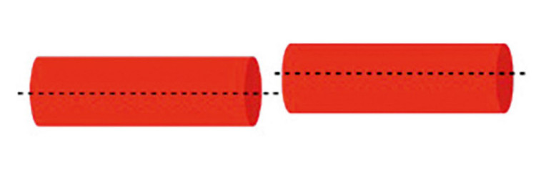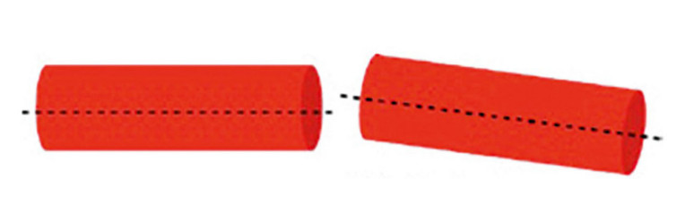 Rozróżnić można dwie sytuacje. W przypadku niewspółosiowości kątowej oś jednego z wałów jest przekrzywiona (rys. 1). Na charakterystyce częstotliwościowej sygnału z czujnika, który mierzy drgania osiowe, widoczne będą: składowa odpowiadająca jednokrotności prędkości obrotowej wału (1 × RPM), szczególnie jeżeli dodatkowo występuje niewyważenie wału, druga harmoniczna (2 × RPM), a nawet trzecia i czwarta (3 × RPM, 4 × RPM), jeżeli ponadto występują luzy albo wał jest zużyty. Dominuje jednak druga harmoniczna, która ma wartość równą albo większą niż składowa podstawowa. Wynika to stąd, że niewspółosiowo ustawione wały wyginają się dwukrotnie podczas każdego pełnego obrotu (góra–dół albo lewo–prawo). Efektem są dwie zmiany kierunku siły w czasie jednego obrotu, w związku z czym występują dwa piki drgań na obrót (2 × RPM). Drgania w kierunku promieniowym będą z kolei pomijalne. Zarejestrować także można przesunięcie fazy drgań po obu stronach sprzęgła o 180°. W przypadku niewspółosiowości osiowej – polegającej na tym, że wały są wprawdzie ustawione równolegle, ale równocześnie przesunięte względem siebie (rys. 2) – również dominuje druga harmoniczna i występuje przesunięcie w fazie o 180°.