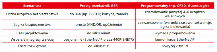 Rekomendacja: w typowych aplikacjach maszynowych (OEM, retrofit, małe maszyny) przekaźnik GSR stanowi optymalny wybór. W dużych systemach i złożonych liniach warto sięgnąć po sterownik bezpieczeństwa.