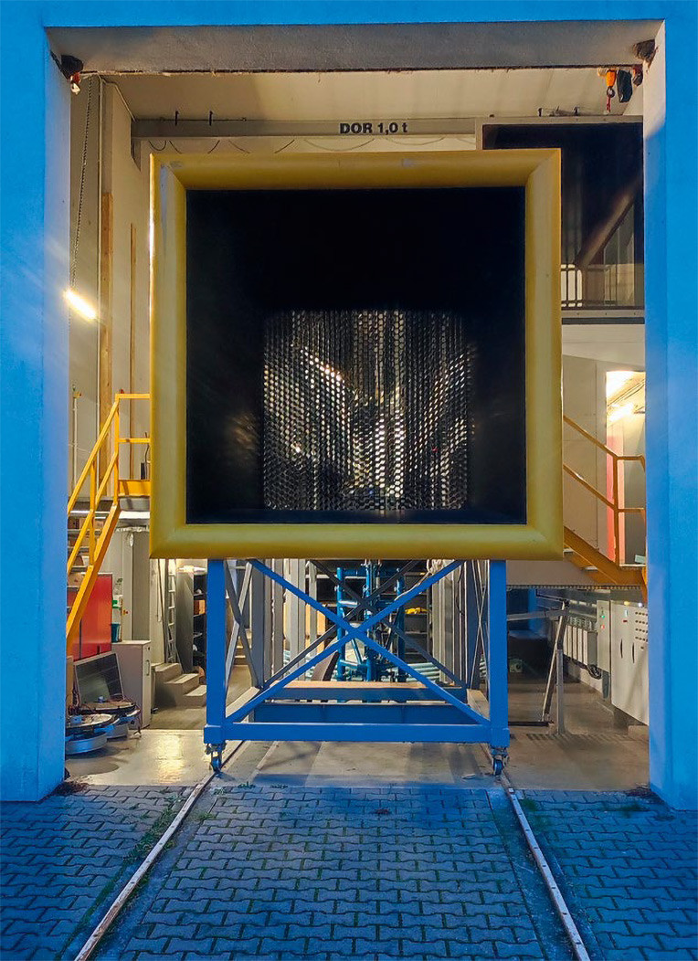 Tak, to nasz najnowszy obiekt – tunel zbudowany jako integralna część CB KEZO. Zaprojektowano go tak, aby poza typowymi pomiarami aerodynamicznymi umożliwiał także badanie charakterystyk aero-mechaniczno-elektrycznych elektrowni wiatrowych. Tunel ma układ otwarty – powietrze przepływa od wlotu przez komorę badawczą i wylotem wraca do atmosfery, podobnie jak w tunelu naddźwiękowym. Ruch powietrza wymuszają wentylatory ssące na wylocie, które zasysają strumień powietrza i nadają mu odpowiednią prędkość. Komora pomiarowa ma przekrój 2×2 m, a zespół napędowy tworzy szesnaście wentylatorów o mocy 16 kW każdy – łącznie ponad 0,25 MW. Dzięki temu możemy rozpędzić słup powietrza o przekroju 2×2 m do prędkości 150 km/h i prowadzić pomiary w takich warunkach przez dowolnie długi czas. To kolejny unikatowy w skali kraju i nie tylko obiekt badawczy